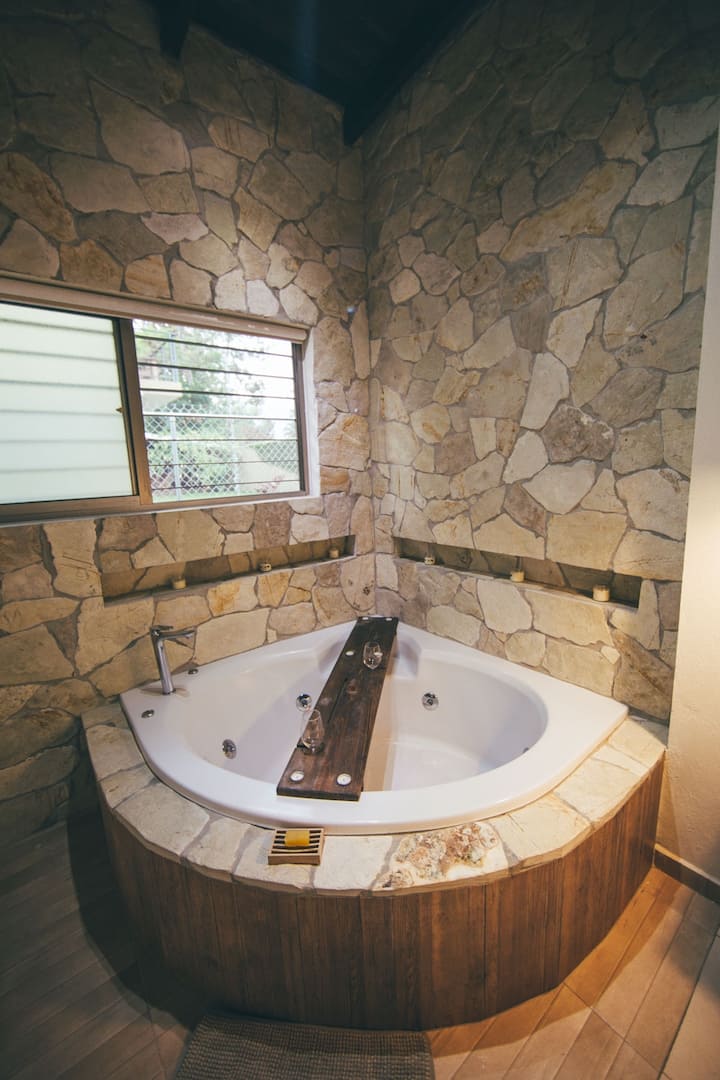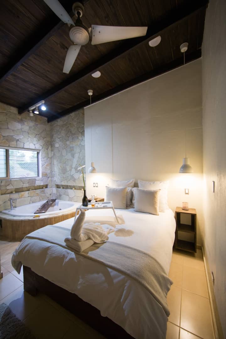 ห้องขนาดเล็กพร้อมเตียงควีนไซส์ มีอ่างจากุซซี่และเครื่องปรับอากาศ