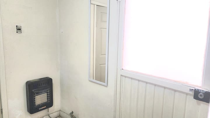 ห้องพักขนาดเล็กพร้อมเตียงเดี่ยวและห้องน้ำ