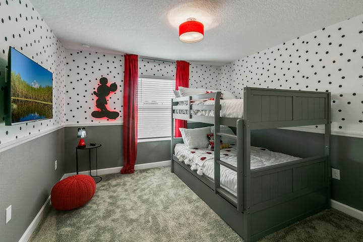 ห้องนอนธีมมิกกี้ชั้นสอง: เตียงสองชั้นพร้อมเตียงคู่ 2 หลังและเตียงเดี่ยวมาตรฐาน 1 หลังสมาร์ททีวีติดผนังตู้เสื้อผ้าและตู้เสื้อผ้า ห้องนี้เข้าพักได้สูงสุด 5 คน