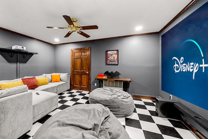 มีโปรเจคเตอร์สมาร์ทขนาด 4k พร้อมการสมัครรับข้อมูลเพิ่มเติมสำหรับ Disney +, HULU และ ESPN หน้าจอขนาด 120 "ที่กำหนดเองและระบบเสียง Dolby Atmos 5.1 ผ่อนคลายไปกับบีนแบ็กยักษ์หรือนั่งบีนแบ็กยักษ์และเพลิดเพลินกับประสบการณ์คุณภาพโรงละคร