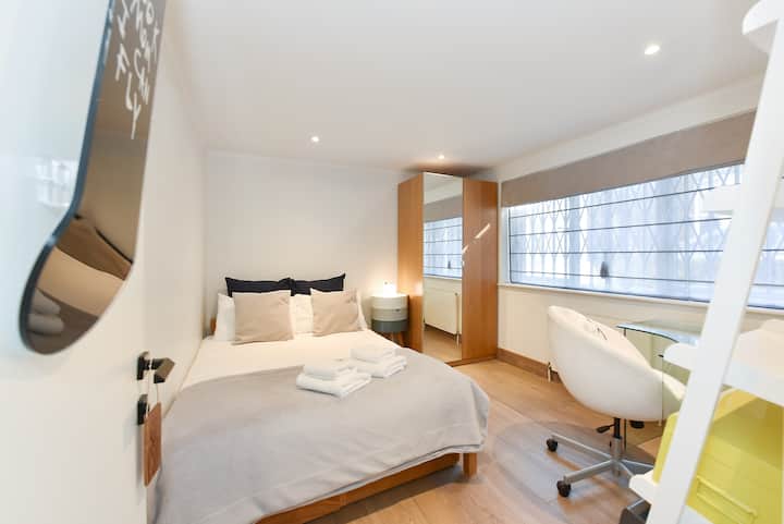ห้องนอนใหญ่ตั้งอยู่ตรงข้ามห้องโถงจากพื้นที่นั่งเล่น มีเตียงคู่ที่สบาย พื้นที่ตู้เสื้อผ้าในตัวขนาดใหญ่ และหน้าต่างกระจกสองชั้นที่มองเห็นถนน ห้องน้ำในตัวมีฝักบัวแบบเดินเข้าได้ที่ทันสมัยและตกแต่งอย่างหรูหรา มีที่นอนบนพื้นคุณภาพให้บริการตามคำขอสำหรับผู้เข้าพักคนที่ 5 และมีเตียงเด็กให้บริการตามคำขอ