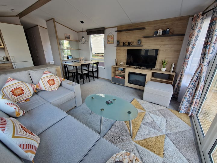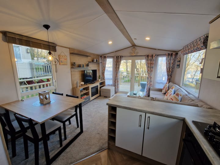 รูปแบบเปิดโล่งมีห้องครัวและโต๊ะรับประทานอาหารที่มีอุปกรณ์ครบครันสำหรับนั่ง 6 ที่นั่ง พื้นที่เลานจ์มีประตูลานบ้านขนาดใหญ่ล้อมรอบโซฟาพร้อมสมาร์ททีวีและเตาผิงสำหรับทำความร้อนเพิ่มเติมในช่วงฤดูหนาว