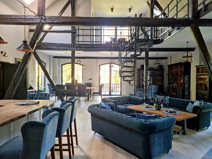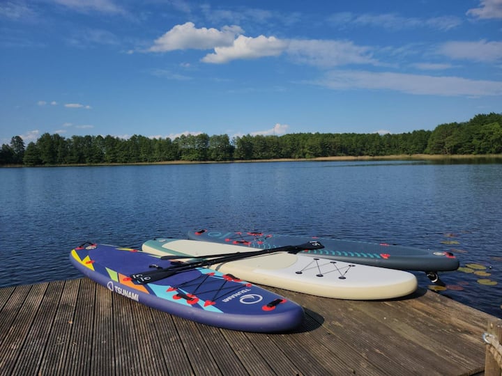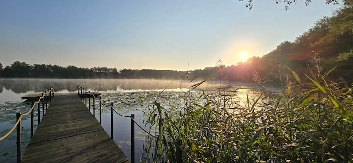โรงนาแดงที่มีทางเข้าทะเลสาบและห้องซาวน่า