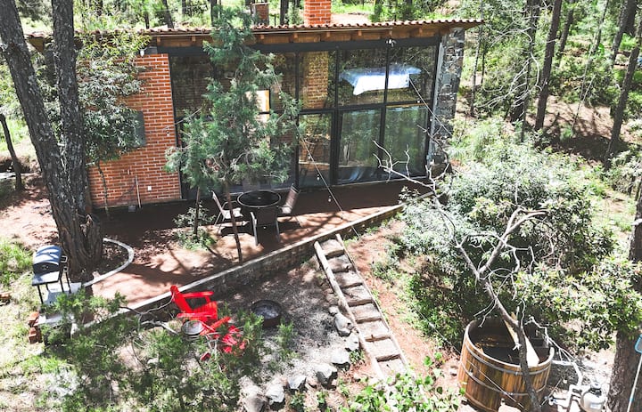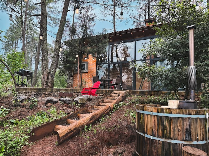 เคบินที่อบอุ่นในป่าพร้อมอ่างอาบน้ำไม้