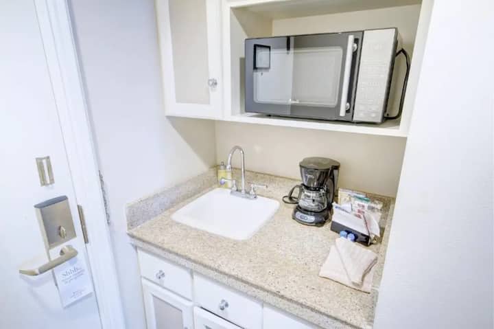 ห้องครัวเล็กมีไมโครเวฟ เครื่องชงกาแฟ และตู้เย็น