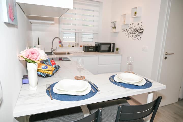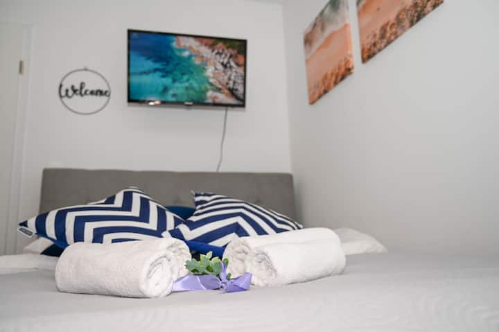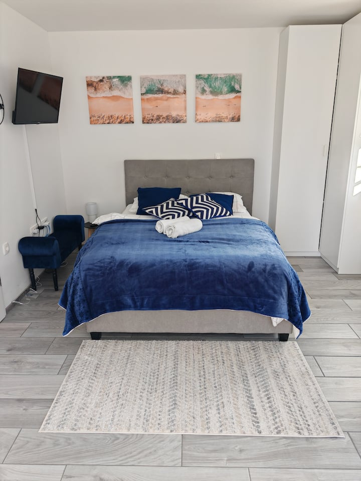 ห้องพักสีฟ้าพร้อมที่จอดรถฟรี