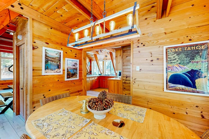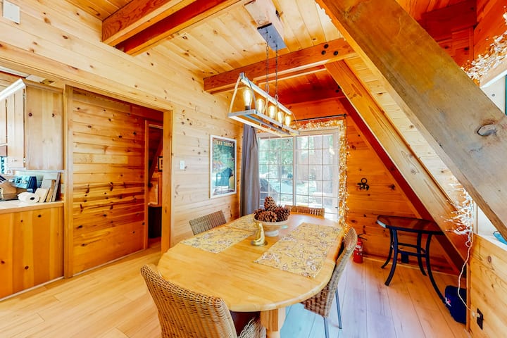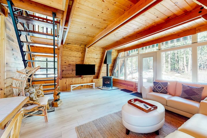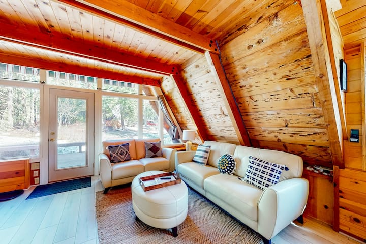 บ้านทรงเอเฟรม 1 ห้องนอนที่เป็นมิตรกับสุนัข มีดาดฟ้า 2 แห่งและเตาผิง