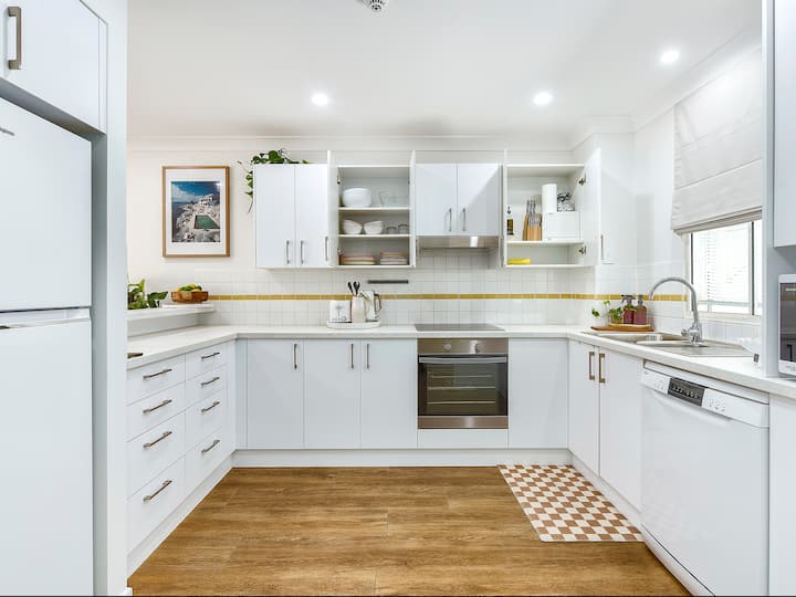 ห้องครัวที่มีอุปกรณ์ครบครันพร้อมเครื่องล้างจานตู้เย็น/ตู้แช่แข็งและเครื่องชงกาแฟ Nespresso เหมาะสำหรับการรับประทานอาหารจานด่วนหรือความบันเทิง