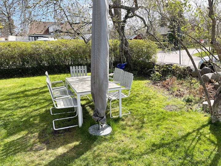 ในสวนเล็กๆที่หน้าบ้านคุณสามารถนั่งพักผ่อนได้ ที่นี่คุณสามารถทานอาหารเช้าหรืออาหารเย็นได้เนื่องจากมีทั้งโต๊ะและเก้าอี้เตาปิ้งย่างร่มกันแดดและชิงช้าสำหรับเด็ก คุณแทบจะไม่สังเกตเห็นว่าบ้านอยู่ถัดจากอาคารที่พักอาศัยของเจ้าของ
