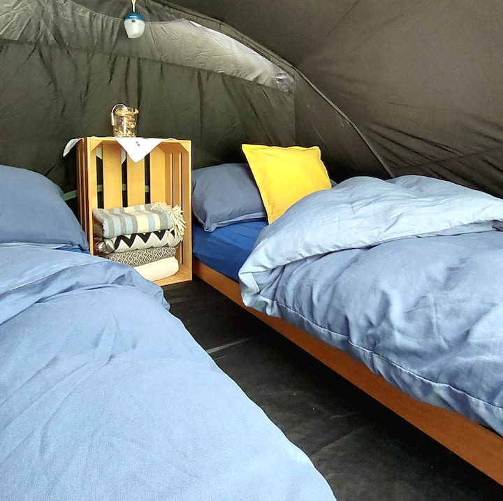 เต็นท์กลามปิ้งในที่ตั้งแคมป์ที่มองเห็นทิวทัศน์ของภูเขา