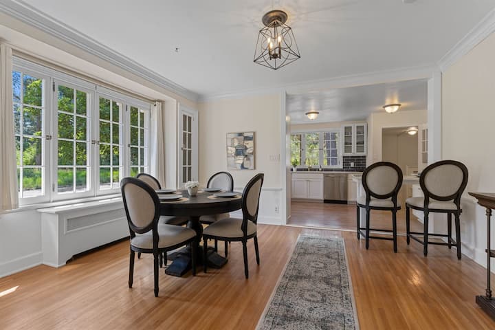 วิวสวนสาธารณะจากห้องครัวห้องนั่งเล่นกว้างขวางและห้องรับประทานอาหารพร้อมที่นั่งสำหรับ 6 คน