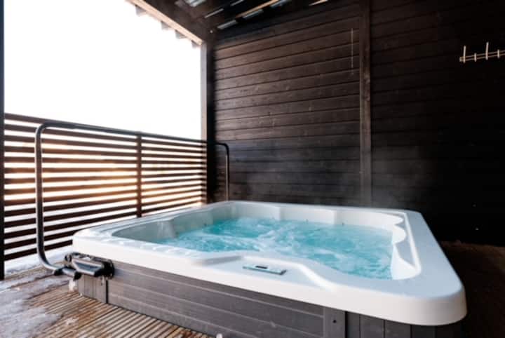 วิลล่ามีอ่างน้ำร้อนกลางแจ้ง และคุณสามารถสลับจากความร้อนของห้องซาวน่าไปยังอ่างน้ำร้อนได้อย่างง่ายดาย อ่างน้ำร้อนกลางแจ้งอยู่บนดาดฟ้าภายใต้ร่มไม้ นอกจากนี้ยังมีเตาย่าง ชุดโต๊ะ และพื้นที่นั่งเล่นบนดาดฟ้า สนามของวิลล่ามีพื้นที่สำหรับรถยนต์มากมาย และยังมีเสาให้ความร้อนรถในสนาม