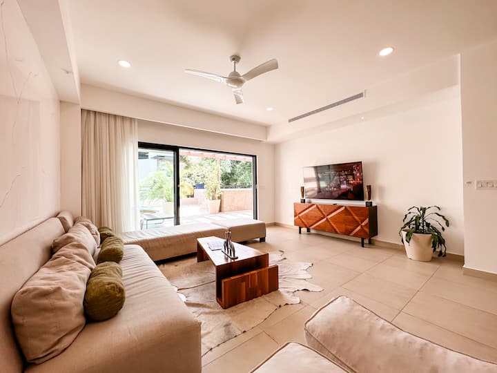 ห้องนั่งเล่น: เพลิดเพลินกับห้องนั่งเล่นที่กว้างขวางและสว่างสดใสของเราพร้อมโซฟาที่สะดวกสบายและการตกแต่งที่ทันสมัย จากที่นี่คุณจะสามารถใช้ระเบียงส่วนตัวที่มีวิวทะเลแบบพาโนรามาและสระว่ายน้ำส่วนตัวได้