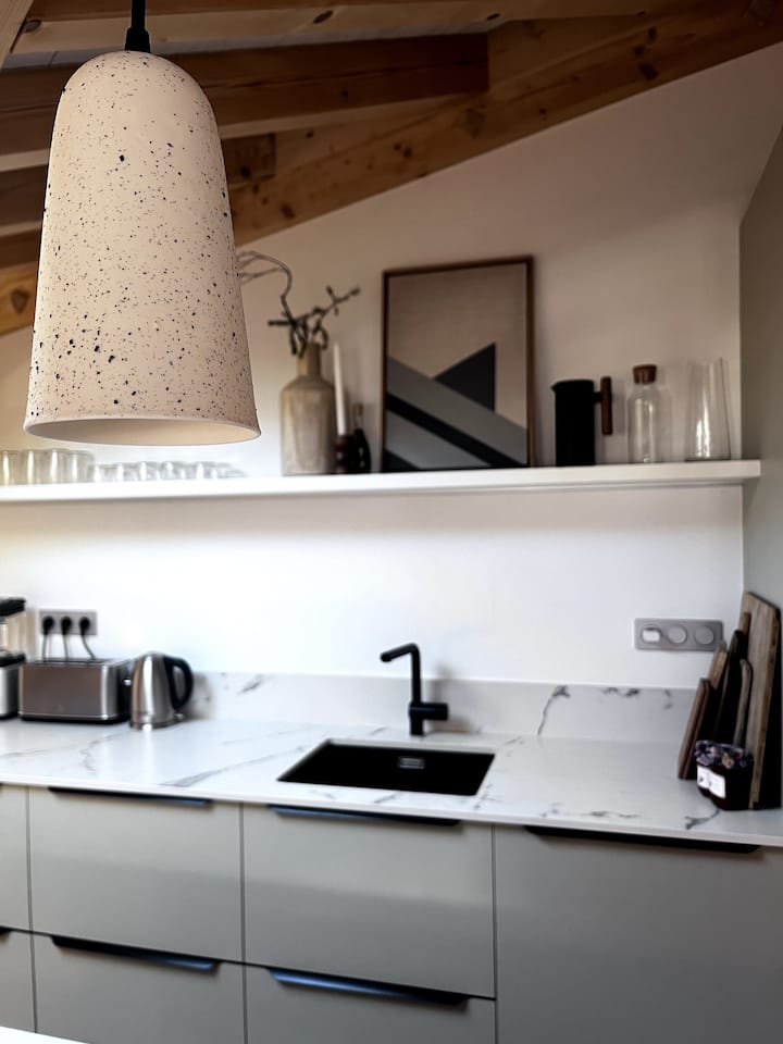 ห้องครัวสองชั้นและเกาะหินระดับไฮเอนด์มีเตาที่หันหน้าออกไปทางผู้เข้าพักของคุณและวิวภูเขาที่น่าอัศจรรย์