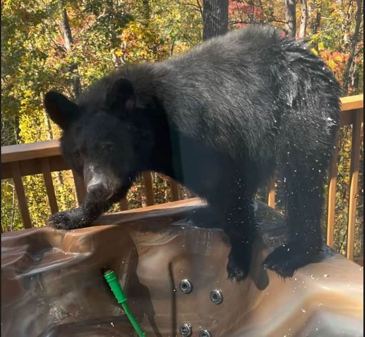 เคบินบนภูเขาที่น่าประทับใจ|หมี|อ่างน้ำร้อน|เตาปิ้งย่าง|ดาดฟ้า