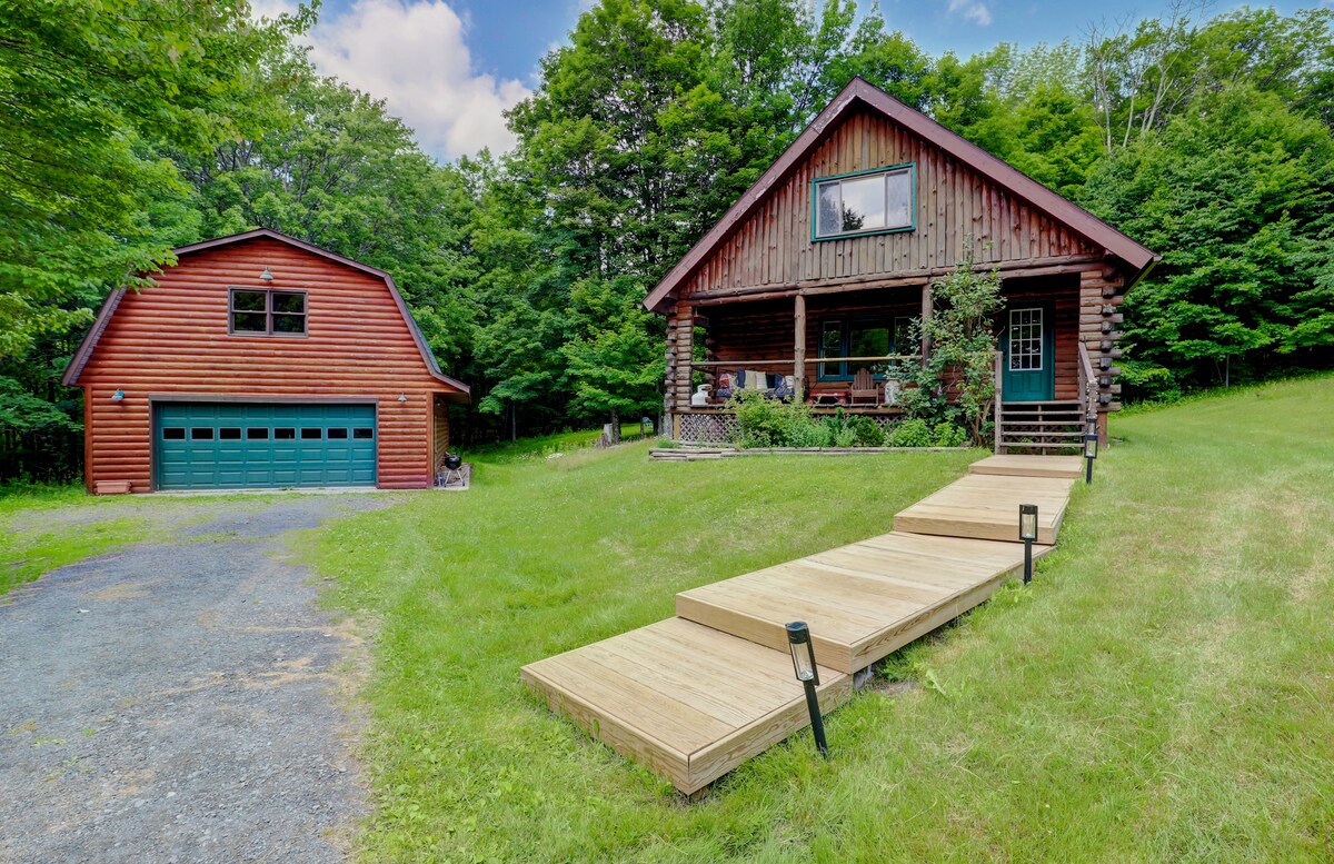 เคบินไม้ในท้องฟ้าที่มีวิวภูเขาในแคทสกิล
